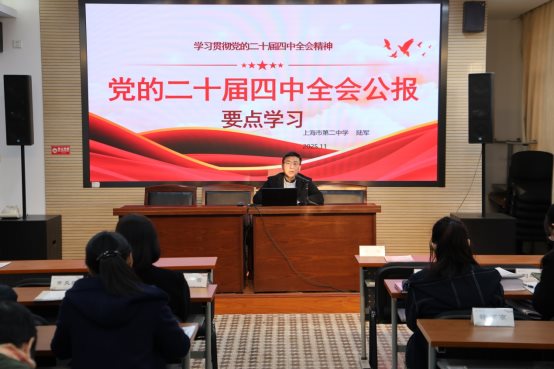 2025年11月28日,上海市第二中学全体教职员工齐聚会议室,开展以“党的二十届四中全会公报要点学习”为主题的政治学习活动,本次活动由校党委书记陆军主讲。
