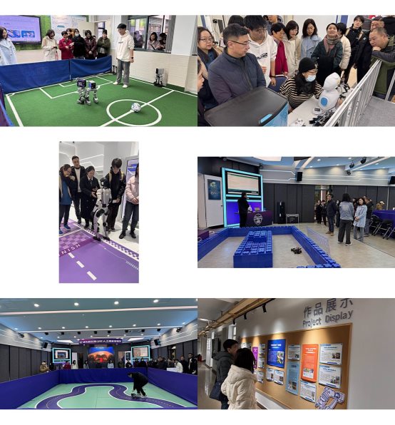 C区AIGC及AI音乐创作体验区中,华为昇腾AI服务器、音乐仓、AI创想家等软硬件平台开放互动,构建起从硬件认知到创意实践的完整学习路径。D区元宇宙体验区的专业动作捕捉空间内,虚拟机器人拳击表演与虚拟主播舞蹈等虚实融合场景轮番呈现,直观展现了元宇宙技术在娱乐、社交与教育领域的广阔应用前景。E区足球机器人体验区则以小Π机器人为载体,生动呈现“具身智能”实践场景,不少教师亲自参与体验,感受人工智能在创意生成领域的强大能力。其高度拟人的步态控制与动态适应能力让人印象深刻。
